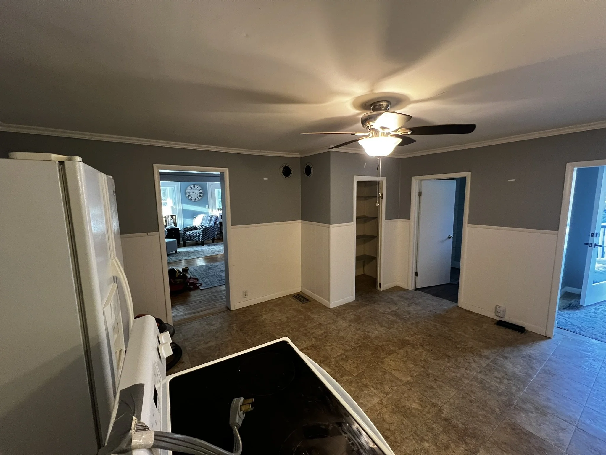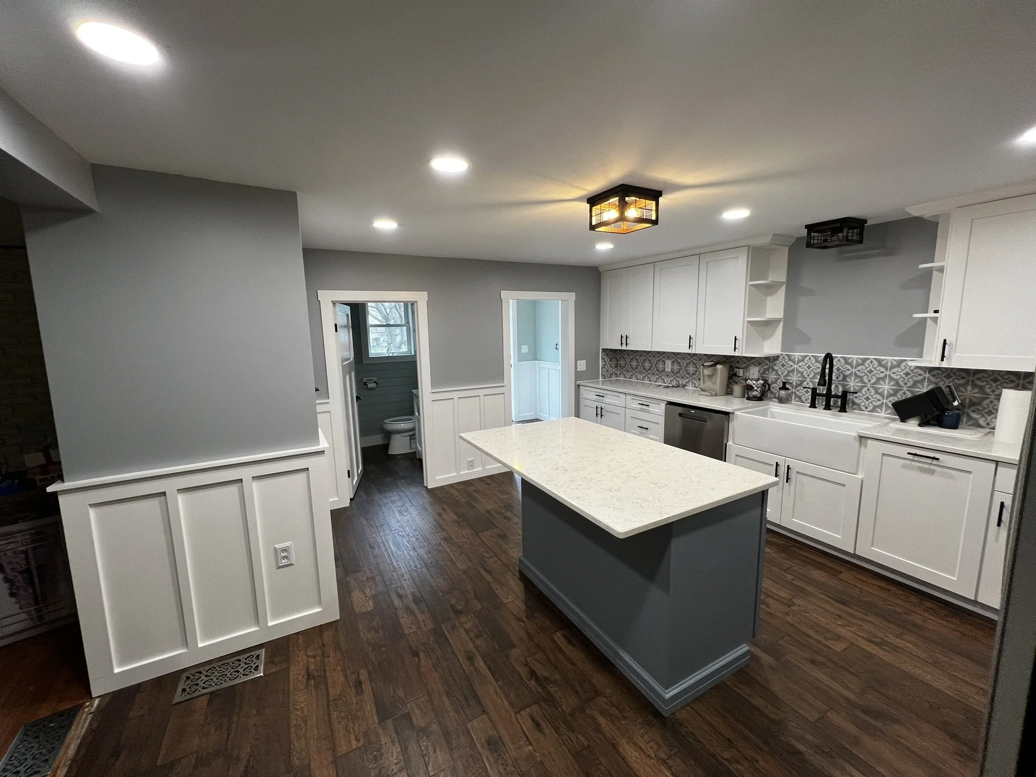 A comprehensive kitchen remodel with custom wainscoting detail and crown molding.